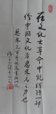 由于拙撰在台湾出版,出版机构三民书局(三个小民所办)在台湾享有盛誉,我自然有了一批台湾读者。通过与台湾读者的直接或间接接触,我发现他们中有很大一部分人对已故郭沫若院长竟颇多微辞,对此我难以无动于衷。所以2011年乘拙撰“纪念辛亥革命100周年专版”出版之际,我不仅力争用郭体字来排印书名,并且还力争把于立群夫人1976年春节给我的题字也刊登出来。此举不消说得付出相应的代价!但我终究获得了回报,不少台湾读者由此了解到郭老晚年还有不广为人知的另一面,在那个六亲不认、你死我活的特殊年代,那是多么难能可贵的一面。高处不胜寒,试问那些责备求全者,如果他们处于郭老的地位,他们能做到吗?