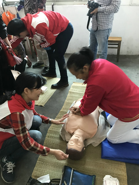 “先判断病人意识,然后呼救求援,心脏按压、人工呼吸,捏住病人的鼻子,用嘴唇包住对方的嘴唇吹气……”市红十字会负责人边讲解边给村民示范。在市红十字会有关负责人和志愿者的引导下,村民们争相体验心肺复苏实操。